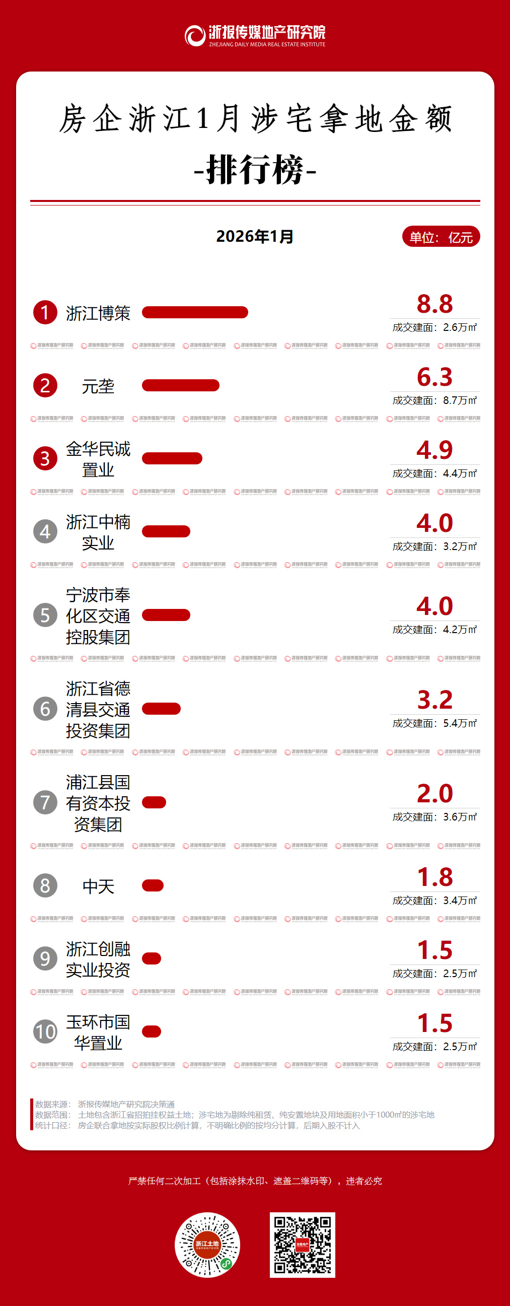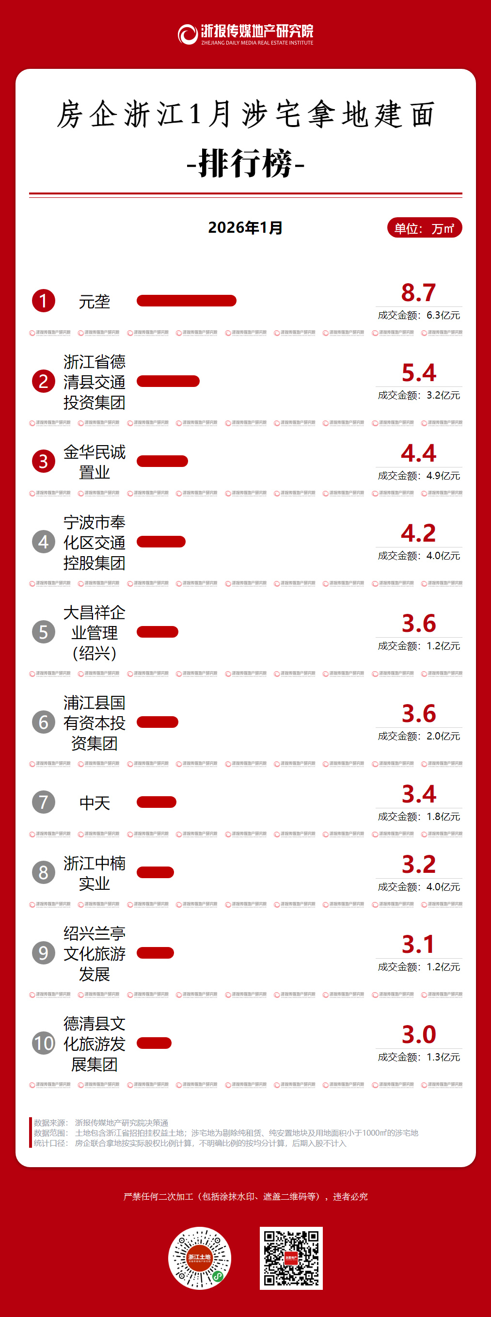 2026年首月浙江土地榜:涉宅地出让金同比回落77%