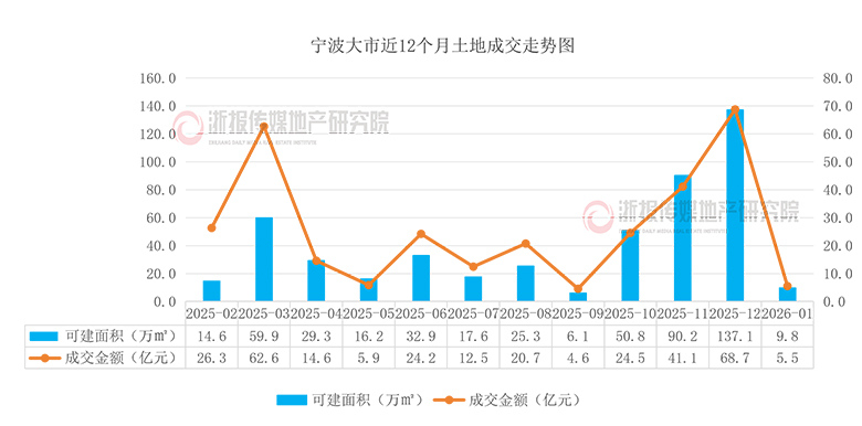 2026年1月,宁波大市共计供应5宗经营性用地,其中成功出让4宗,用地面积13.52万㎡(约203亩),总建筑面积9.8万㎡,成交金额5.5亿元。