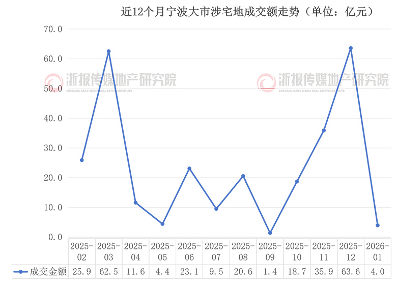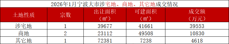 2026年1月,宁波大市内1宗涉宅地块成交,出让面积3.97万㎡(约59.52亩),总建筑面积4.17万㎡,成交金额3.96亿元。