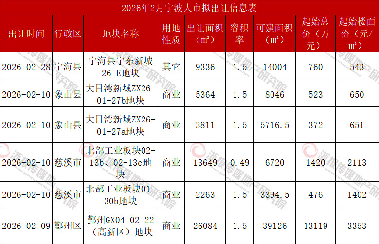 截至目前,宁波市2026年2月预计出让6宗经营性用地,其中涉宅地1宗。