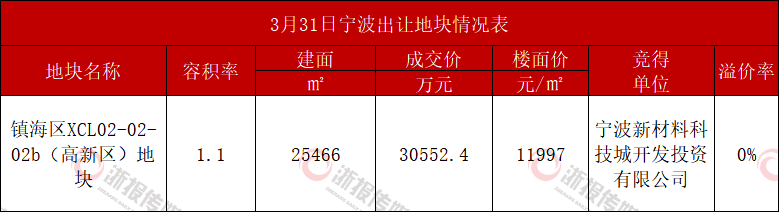 住在杭州网3月31日讯(记者 郑青青)今日,宁波镇海区一宗容积率仅1.05的低密宅地出让。该地块位于贵驷街道、贝时璋学校南侧,最终由宁波新材料科技城开发投资有限公司总价30552.4万元竞得,成交楼面价11997元/㎡。