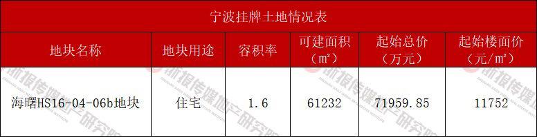 海曙HS16-04-06b地块(原宁波电视台地块)出让面积38270㎡(折合57.41亩),容积率1.1-1.6,可建面积6.12万㎡,起始总价71959.85万元,起始楼面11752元/㎡。