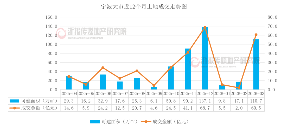 2026年3月,宁波大市共计供应17宗经营性用地,其中成功出让16宗,用地面积57.78万㎡(约867亩),总建筑面积110.7万㎡,成交金额60.5亿元。