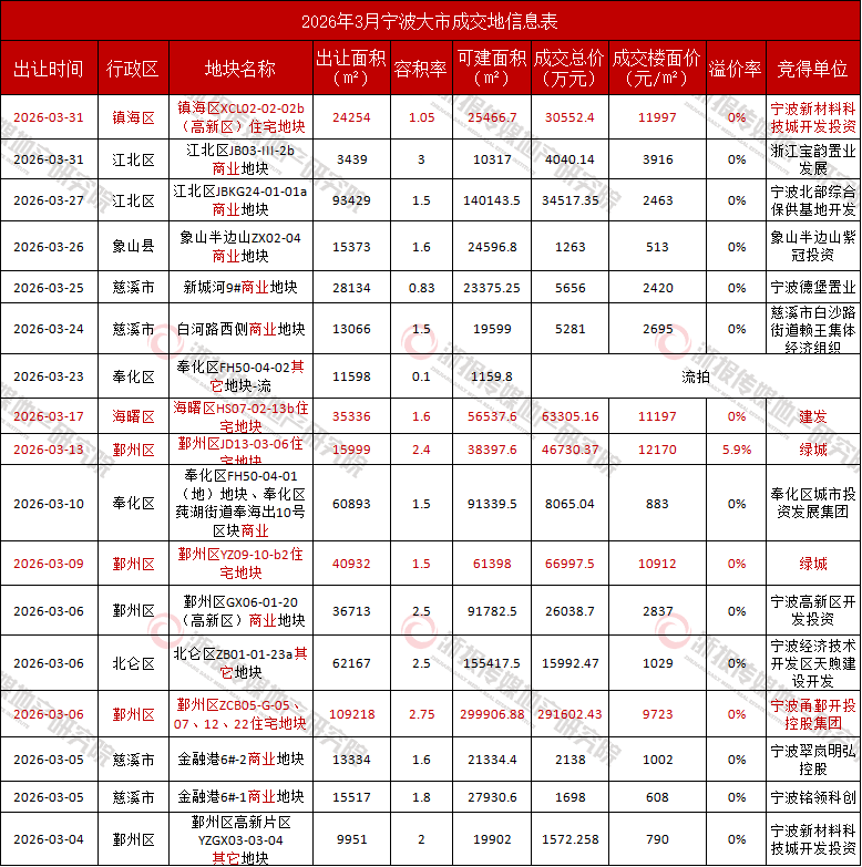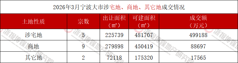 2026年3月,宁波大市内共成交16宗经营性用地,其中涉宅地块成交5宗,出让面积22.57万㎡(约338.61亩),总建筑面积48.1707万㎡,成交金额49.92亿元。