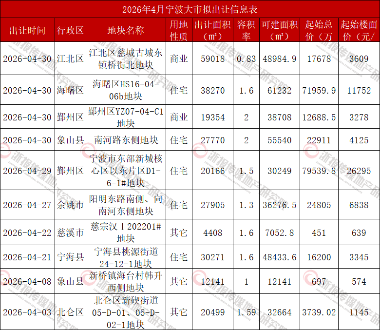 2026年4月宁波大市预计出让土地信息表