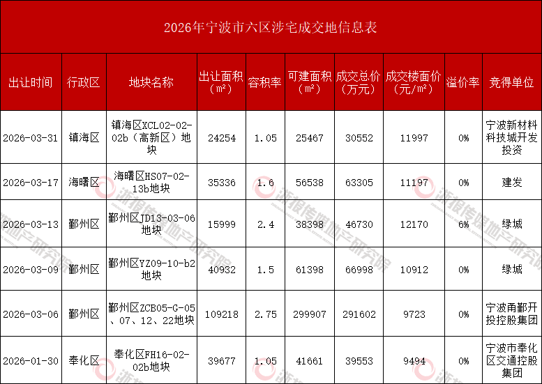 2026年宁波市六区土地成交情况