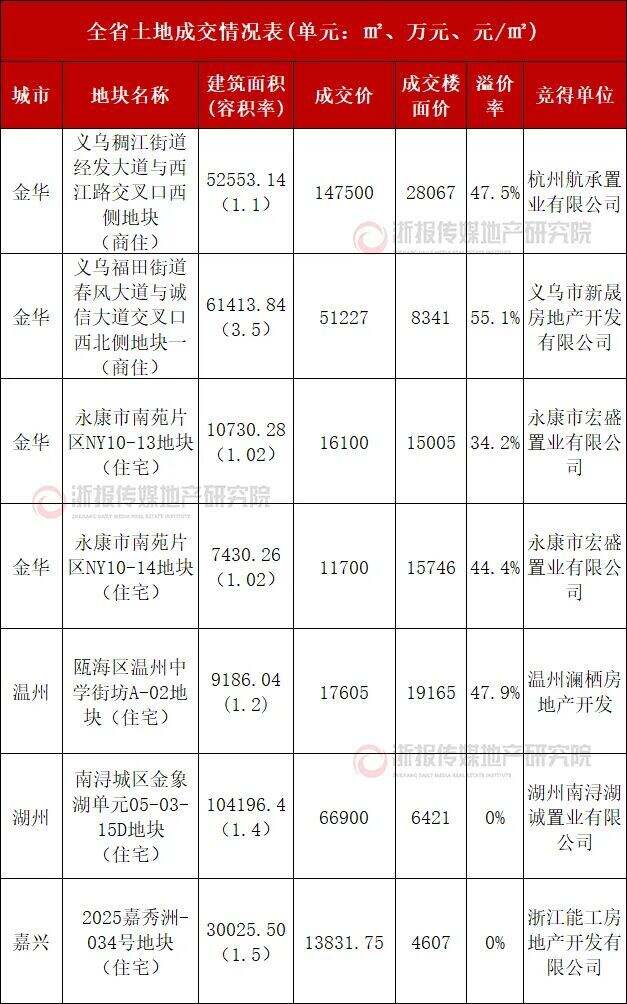 住在杭州网9月30日讯(记者 章嵘嵘)9月30日,浙江省7宗重点地块成交,其中金华义乌、永康以及温州瓯海多宗低密地块热度较高。