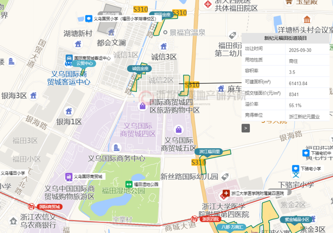 另一宗地块福田街道春风大道与诚信大道交叉口西北侧地块一,为“垂直楼”地块,由义乌市新晟房地产开发有限公司即浙江新纪元置业溢价55.1%竞得,成交楼面价8341元/㎡。竞得者同区域已布局福田金座项目,于2024年底以楼面价10286元/㎡竞得,同样溢价50%以上。