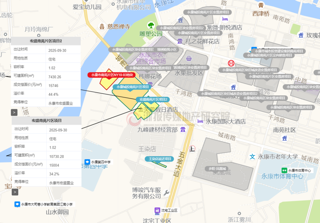 位于金华永康的南苑片区NY10-13地块与南苑片区NY10-14地块,最终由本土房企永康市宏盛置业有限公司包揽,合计总价2.78亿元,综合楼面价15308元/㎡,综合溢价率38%。
