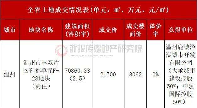 住在杭州网10月27日讯(记者 章嵘嵘)10月27日,温州市丰双片区鞋都单元F-28地块底价成交,由本土企业温州鹿城泽泓城市开发有限公司竞得,地块成交总价21700万元,成交楼面价3062元/㎡。