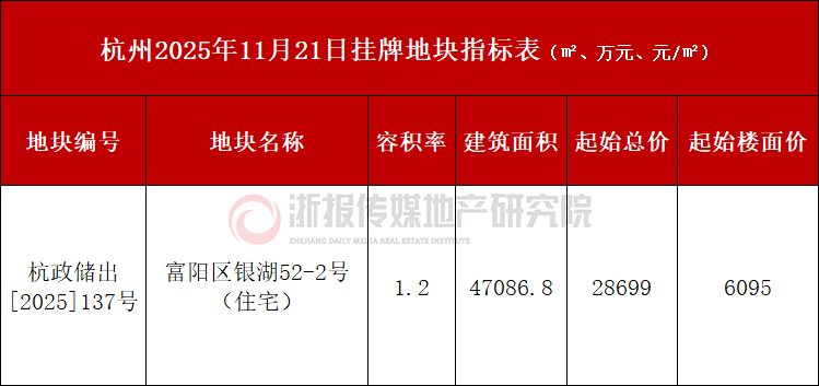 住在杭州网11月21日讯(记者 章嵘嵘)今早,富阳区挂牌一宗低密住宅用地银湖52-2号地块,该地块位于银湖板块,出让面积39239㎡,容积率1.2,可建面积约4.7万㎡,起始楼面价6095元/㎡,计划于12月23日出让。